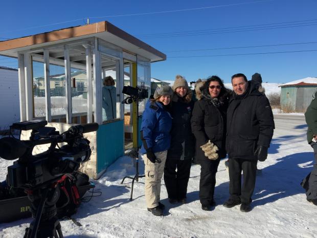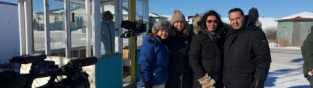 Red Snow Producer Michelle Morris, NWT Film Commissioner Camilla MacEachern, Red Snow Writer & Director Marie Clements, and Minister Wally Schumann smile on the set of Red Snow in Dettah.