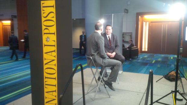 Minister Schumann takes an interview with the National Post during PDAC 2018 in Toronto.