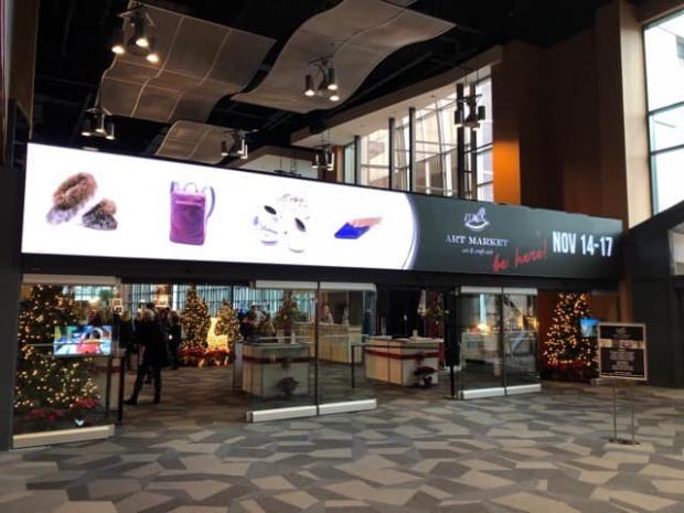 (Photo: a photo of Catherine Cockney’s sealskin children’s moccasins used in the event signage. This image was one of eight rotating images chosen for the four-day show)