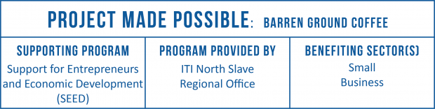 Today, Barren Ground coffee stocks the shelves of Yellowknife’s Co-op, Fat Fox Café and Blachford Lake Lodge; Norman Wells’ Rampart Rentals; and Hay River’s She Takes the Cake café. The team hopes to have their coffee available in Inuvik and Fort Smith in the coming weeks.