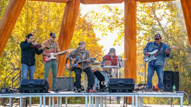 L’événement a commencé par une cérémonie d’offrande au feu qui a été prise en charge par les exploitants d’entreprises touristiques Gilbert et Mary-Jane Cazon des services de traduction, d’interprétation et de transcription K’iyeli. Johnny Laundry et son groupe, avec Wesley Hardisty, violoneux de la région du Dehcho, sont montés sur scène. Ils sont les premiers musiciens à jouer à l’intérieur du tipi en bois de 17 m de hauteur. C’est dans ce magnifique endroit que les membres de la communauté ont pu profiter d’un barbecue gratuit et se livrer au tir à l’arc, au sciage de bûches, à l’achat de produits locaux et à la danse. Après le concert, la danse s’est transformée en une danse au tambour communautaire qui s’est poursuivie tard dans la nuit.