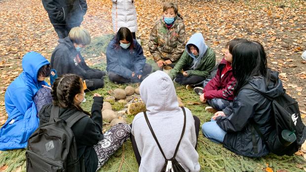 Mary Jane et les élèves assis sur des branches d’épinette autour d’un feu