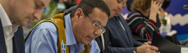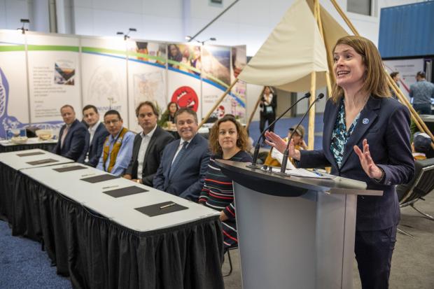 La première ministre Caroline Cochrane et la ministre de l’Industrie, du Tourisme et de l’Investissement Katrina Nokleby se sont jointes aux dirigeants de Det’on Cho-Nahanni, de la Première Nation des Dénés Yellowknives et de Cheetah Resources lors de la cérémonie de signature du contrat à la conférence Roundup de l’AME.