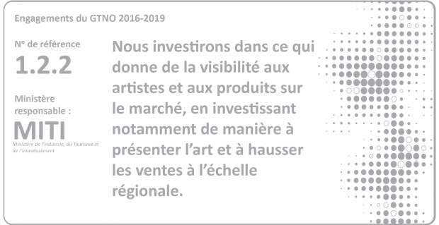 Par l’intermédiaire d’Arts TNO, le ministère de l’Industrie, du Tourisme et de l’Investissement fait la promotion des artistes du Nord non seulement aux TNO, mais à l’échelle mondiale. Un marché de l’art fort n’est qu’une seule des facettes de nos efforts de diversification économiques à l’intention des résidents des Territoires du Nord-Ouest.