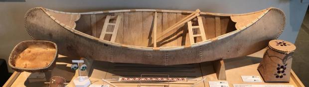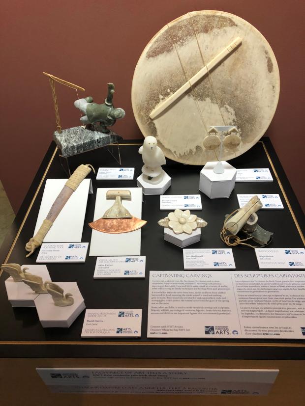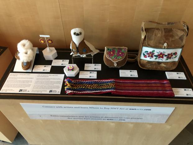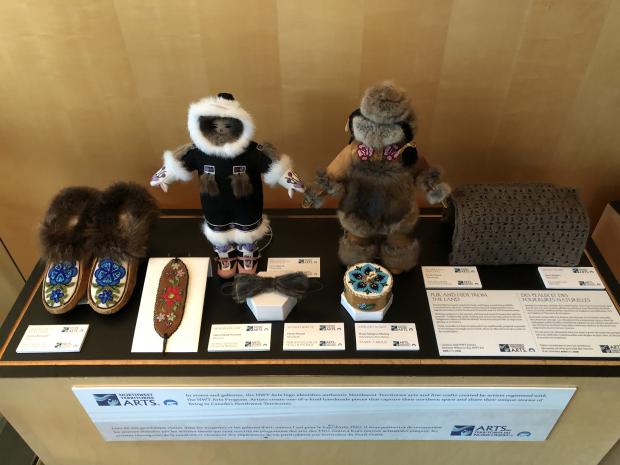 Un ulu en cuivre avec poignée en os de caribou, des lunettes de neige, un nœud papillon en peau de phoque, une poupée dénée décorée et un canot d’écorce magnifiquement détaillé ne sont que quelques-unes des œuvres remarquables d’une nouvelle série de vitrines artistiques installées à l’Assemblée législative des Territoires du Nord-Ouest (TNO).